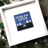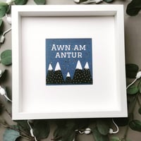 Printed with the text - Awn am Antur which is Welsh for - let's go explore and mounted in a choice of a white or black frame. (27x27cm in size)