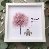 Gyda cwpwl yn eistedd ar fainc gyda calonnau pinc.