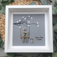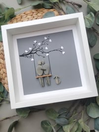 This gorgeous artwork had been created by using pebbles and wood to create a couple on a swing with their pet dog next them. ❤️