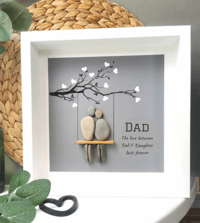Made out of pebbles and wood to create an adult figure with his daughter sat on a swing. This is finished off with little white hearts above them in the branches and the quote