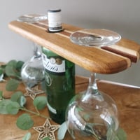 Place this butler over a bottle neck. It holds two stem glasses by balancing one on each side.