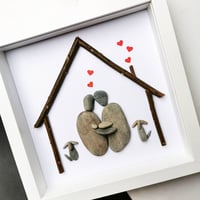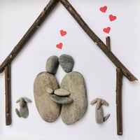 This is the perfect gift for any new arrival... made out of pebbles and wood to show a mother and father holding their Newborn and their two dog by their side underneath a little house design, finished off with little red heart coming out of the chimney and above them.