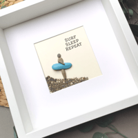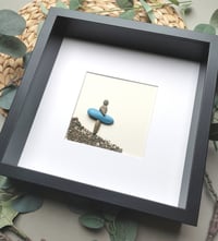 Made from Pebbles and Print to create a figure holding a surf board on the beach.